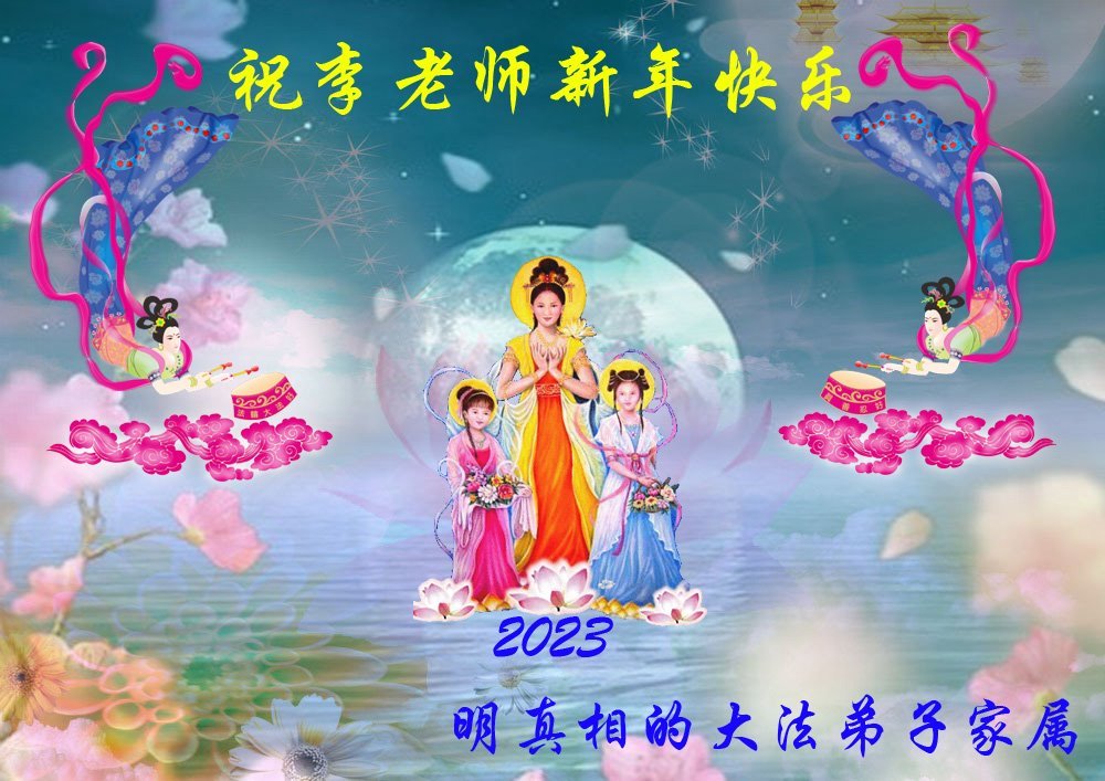 慈悲伟大的师父您好!您辛苦了! 在您的护佑下,我们全家顺利的走过了灾难重重的一年。尤其是这次大陆对疫情的放开,家里人虽然染疫,但是他们坚信师父和大法,真心念真言“法轮大法好、真善忍好”,听师父的讲法录音,三、四天就好了,症状很轻。 在癸卯年钟声敲响之际,弟子全家遥祝慈悲伟大的师父过年好!给师父拜年了! 法轮大法好、真善忍好!愿更多的中国老百姓快快明白大法真相,早日三:退.,为自己选择美好未来。 北京昌平一大法弟子全家敬拜 2023年1月5日 四川成都彭州市明白真相民众全家恭祝李大师新年好!