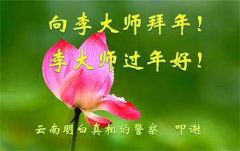 我今年96岁。从当兵到上军校,直到任教授退休,一辈子过的是部队生活。从北方到南方,走过许多地方,现在告老回乡了。身体也很好,无忧无虑,个人生活优越、舒适。但社会腐败现象我很担忧,从政府到军队,从中央到地方,无官不贪,军队更厉害。自从江泽民掌军权后,部队就贪腐、淫乱成风。 共产党是作到头了,天灭中共是有道理的。法轮功说的是真的,我同意退出党组织。祝李大师正法成功,并祝李大师过年好! 招远市乡村一名96岁退休军队教授敬贺 云南明白真相的警察向李大师拜年!李大师过年好!