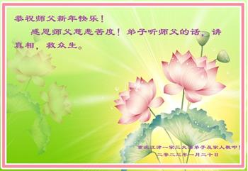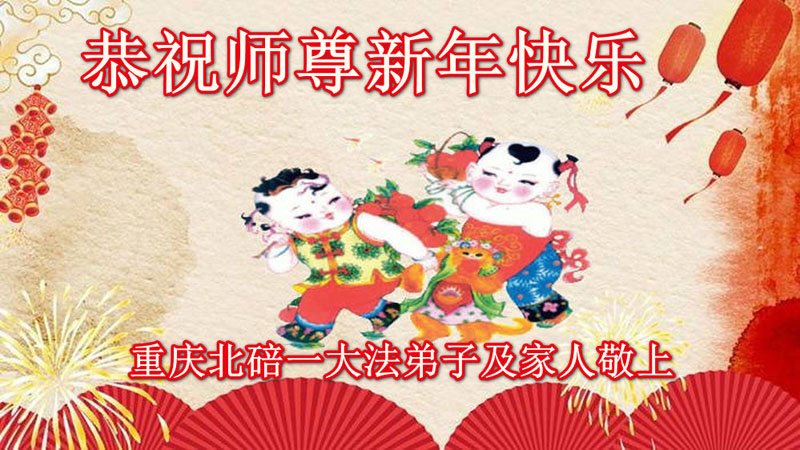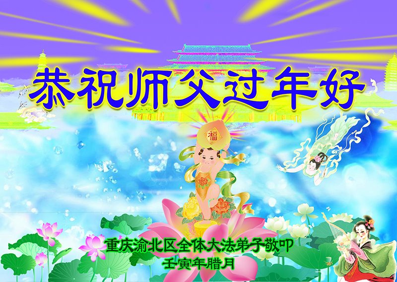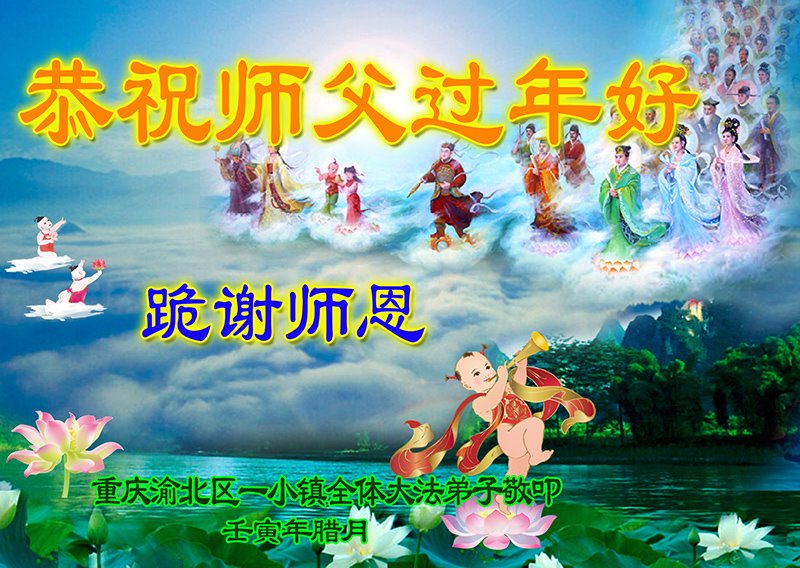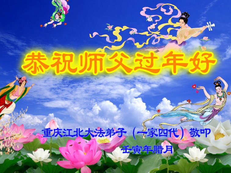 师父啊!中国传统农历新年就要到了,众弟子及被大法救度的众生祝您新年好!感谢师父慈悲救度!您辛苦了! 目前中国大陆疫情严重,我们作为您的弟子,一定会在个人修炼中做好,传播真相,完成师父要我们救度更多众生的使命。已有很多众生正在从中共灌输的谎言中清醒了!我们不能辜负师父的慈悲救度,要尽力去帮助那些下落凡间的众生,圆他们等待大法救度、回归自己家园的梦。 重庆市渝北区一学法小组大法弟子敬上 重庆江津两大法弟子及母亲新同修恭祝师尊新年快乐!
