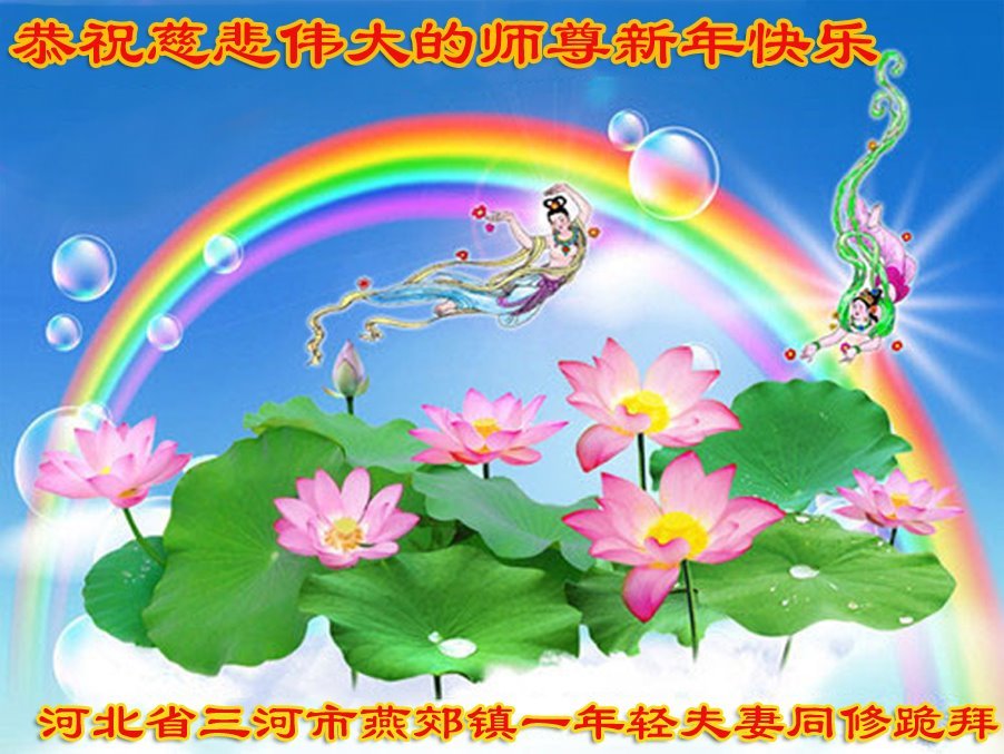 在无比尊敬伟大的师尊的慈悲看护下,经过二十多年的风风雨雨,我们走出了迫害、走出了人;在助师正法、同化大法、清除邪恶救度众生的路上一路走过来,越来越清醒,我们深感生命升华和道德提升的快乐! 值此新年到来之际,在此诚祝恩师新年快乐! 河北省廊坊市大法弟子 河北廊坊市三河燕郊一大法弟子恭祝师尊新年好!