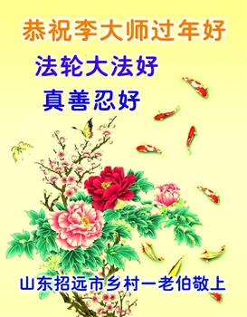 给李大师拜年! 在我胃癌手术化疗过程中,我听了法轮功学员的规劝,诚念“法轮大法好,真善忍好”九字真言,再也没有打过化疗。七年来,复查身体良好,我再也不受病痛折磨了,我们全家都相信大法好了。 新年将来,我们全家叩拜李大师,给李大师磕头,恭祝李大师过年好! 山东省招远市乡村一老伯敬上 山东省烟台市招远市农村大法弟子向师尊问候,恭祝慈悲伟大的师尊过年好!弟子跪拜!