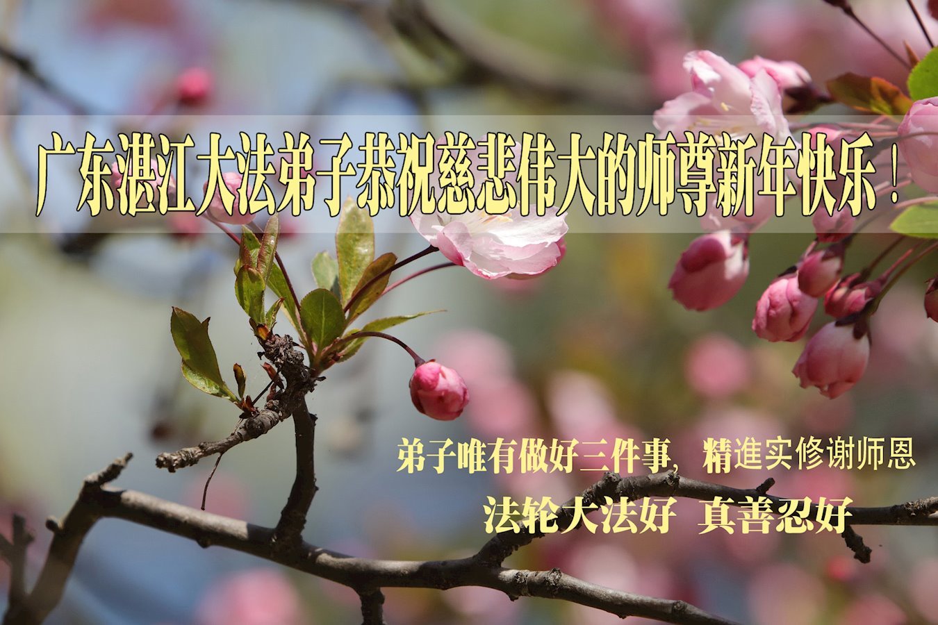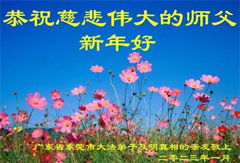 广东东莞大法弟子敬贺师尊新年好! 在这波疫情中,更多亲友主动了解真相,并真心真意的敬念九字真言,在大法护佑下,得以平安度过疫劫,他们真切的知道不药而愈的真正原因,怎能不感恩师尊的慈悲救度! 法轮大法好!真善忍好! 广东湛江大法弟子恭祝师父新年快乐!