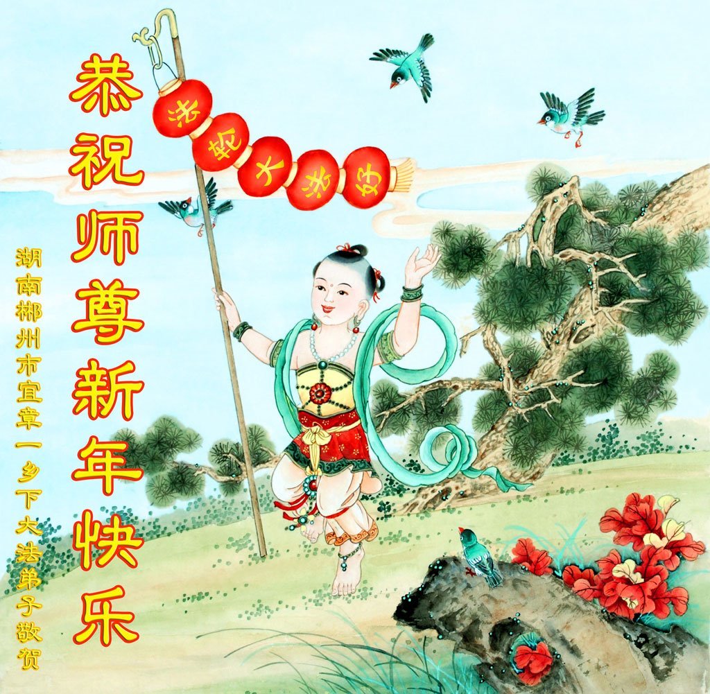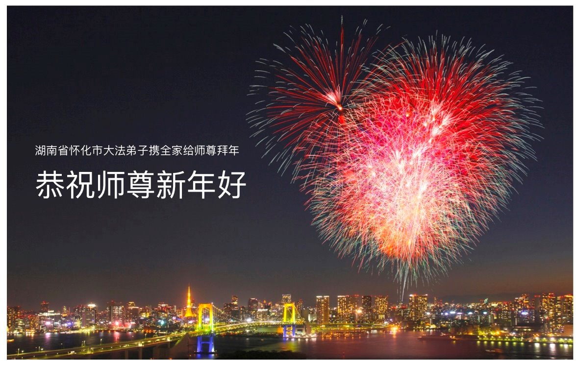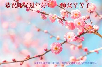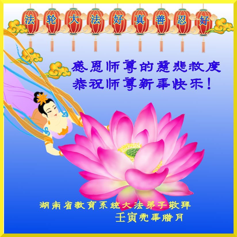 师父好!新年好! 又是一春新年到!弟子无尽感恩师父慈悲救度,在师父赐予弟子的大好时光里做好三件事,勇猛精進,完成使命,圆满随师还,跪拜师尊! 湖南省教育系统大法弟子恭祝师尊新年快乐!