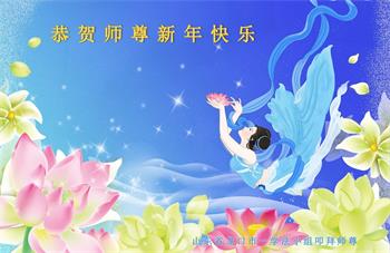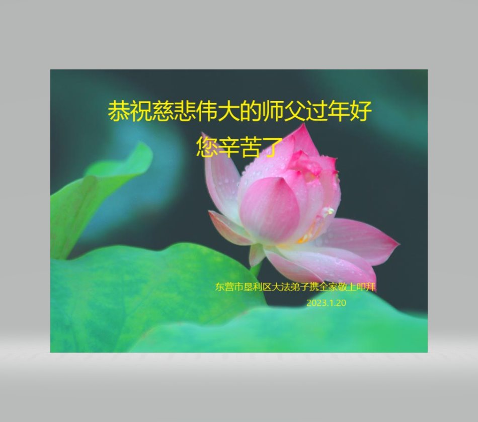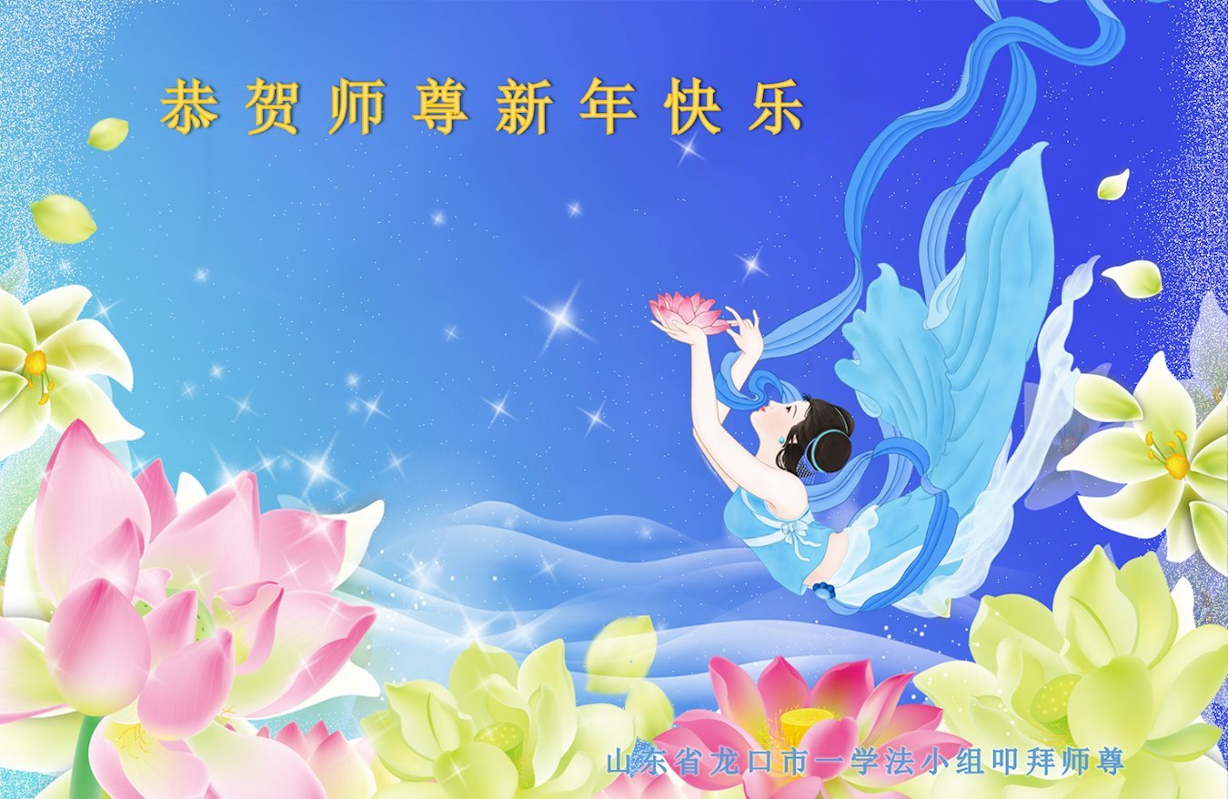 感恩师尊的无量慈悲!我们祈盼着和师尊团聚的这一天,盼着普天同庆的这一刻,迎接您和神韵艺术团回归大陆。在新年到来之际,我们给您拜年:遥拜师尊过年好!师父过年好!过年好!跪拜师尊好!师尊您辛苦了! 我们会永远记住“法轮大法好,真善忍好”这九字真言。 山东省东营大法弟子恭祝师尊新年快乐!