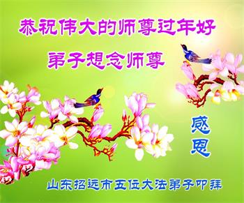 山东莱阳一对母女大法弟子恭祝师尊过年好!感恩师尊慈悲苦度,跪拜师尊!师父,我们以前做的不好,以后好好修炼,听师父的话,做真修弟子。乞求师父宽恕弟子。 山东烟台招远五名大法弟子恭祝慈悲伟大的师尊过年好!