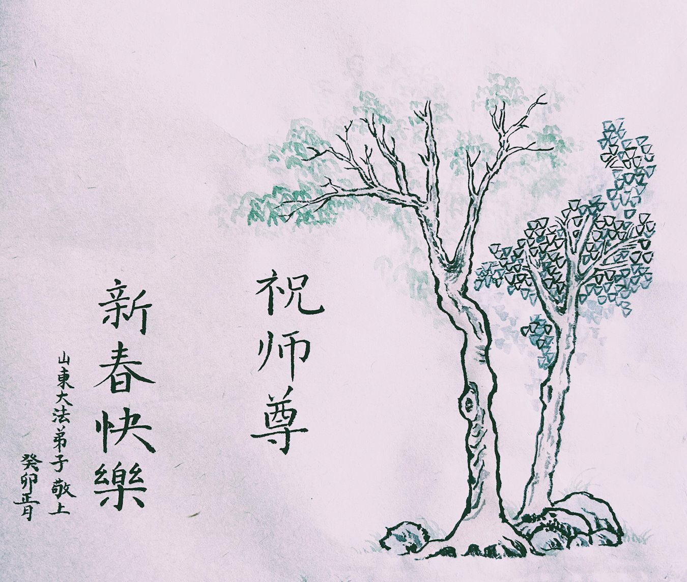弟子手绘一幅画,以此表达弟子对师尊的新年问候,祝师尊新年快乐!在2023年里,弟子一定精進,做好三件事。 山东大法弟子敬上 癸卯正月 山东烟台莱阳龙门大法弟子恭祝师尊癸卯新年好!