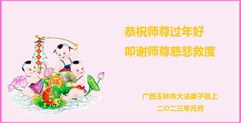 感恩师父的慈悲救度!弟子会坚定不移的跟随师父回家。 广西北海市大法弟子敬上 广西壮族自治区玉林市陆川县全体大法弟子问师父中国新年好!恭祝师父新年快乐!