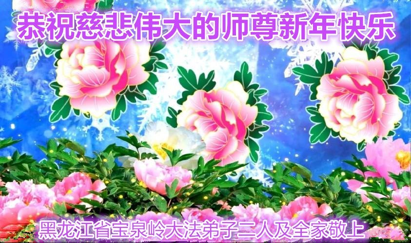 师尊新年好!弟子恭祝慈悲伟大的师尊新年快乐! 弟子感恩您给所有众生延续来的时间,我一定在这有限的时间里成为一名合格的法粒子,我还有很多人心没修去,请师尊加持弟子,谢谢师尊。 弟子叩拜恩师 黑龙江省宝泉岭大法弟子二人携全家恭祝慈悲伟大的师尊新年快乐!