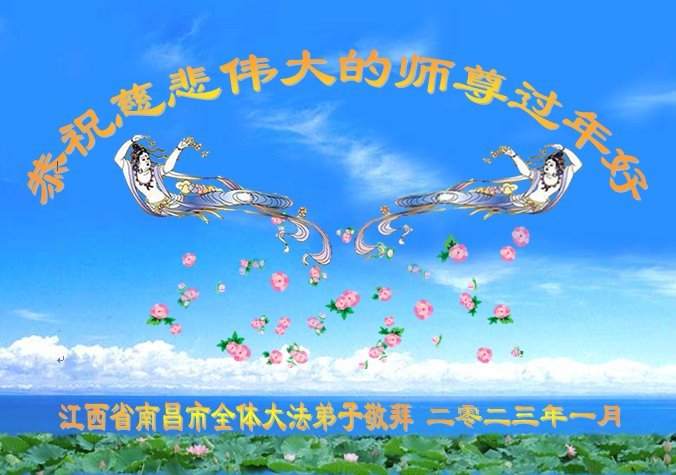 穷尽世上所有美好的语言都无法表达我们对慈悲伟大师尊的无限感恩!叩拜您的救度洪恩!恭祝我们的师尊过年好! 我们牢记师尊教导,走好修炼、救人的最后路程,直至跟师尊圆满回家。 江西新余全体大法弟子敬上 2023年1月18日 江西省南昌两位大法弟子向伟大慈悲的师尊拜年:恭祝师尊新年快乐!