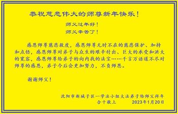 【明慧网二零二三年一月二十三日】 辽宁省沈阳市三位大法弟子恭祝师尊过年好!