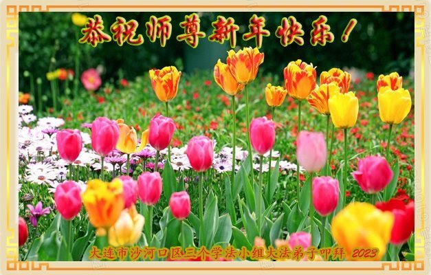 2023年中国大年即将来临,大连三个学法小组全体大法弟子向慈悲伟大的师父拜年!恭祝师父新年好!师父辛苦了! 我们大连三个学法小组,大多是老年大法弟子,在邪恶的迫害中,每一个巨难都是在师父慈悲的保护下才走过来的,弟子们对师父的感恩无以言表。在正法的最后时刻,我们会听师父话:发挥老年人的特长,多讲真相、多救人,用一颗实修的心做好三件事,兑现自己的使命!让师父少一些操心,多一点欣慰! 大连市沙河口区三个学法小组大法弟子叩拜师尊! 二零二三年一月十五日 辽宁省大连市西岗区一学法小组大法弟子恭祝慈悲伟大的师父新年快乐!