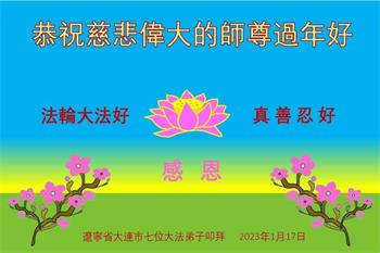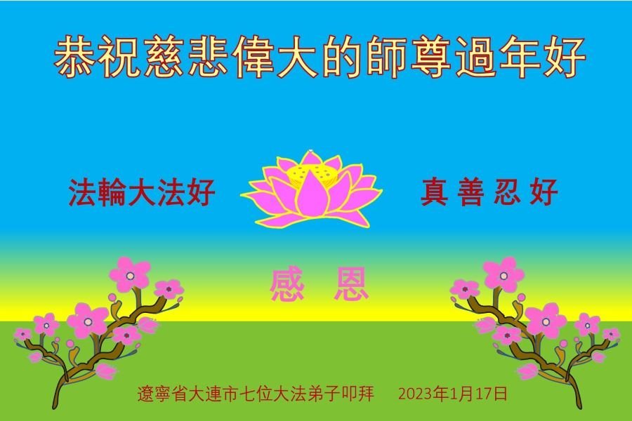 在二零二三年新年来临之际,大法弟子及家人怀着无比感恩的心情恭祝慈悲伟大的师尊新年快乐! 弟子深深的知道,正法已走入最后阶段,现在大疫当前,弟子一定听师父话,做好大法弟子的三件事,助师正法多救人!愿师父多一份宽心,少一份操劳。 弟子盼望与师父团聚的那一天! 大连市甘井子机场一大法弟子及家人叩谢师恩 二零二三年一月十八日 辽宁省大连市七位大法弟子恭祝慈悲伟大的师尊过年好!