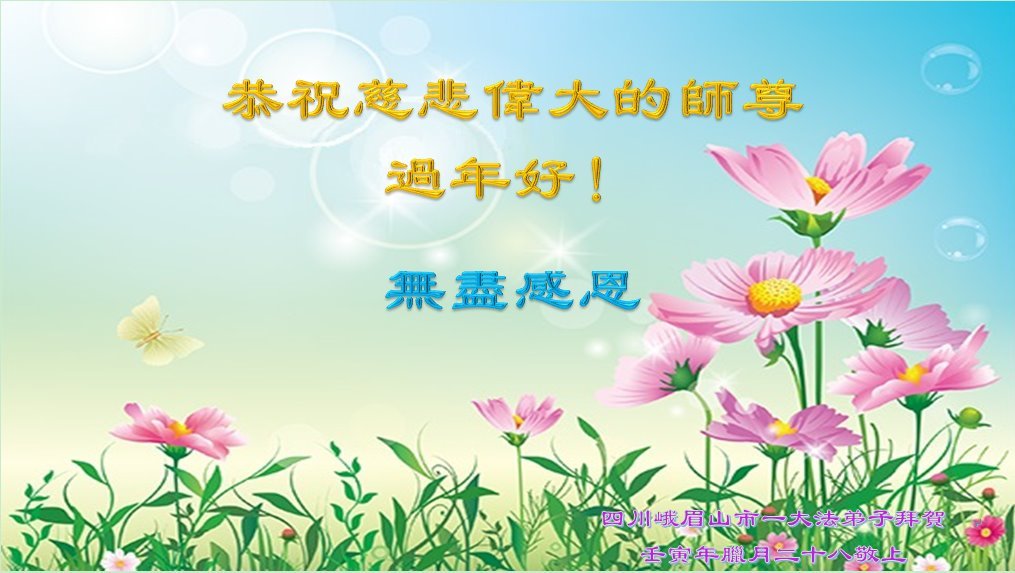 恭祝慈悲伟大的师尊新年快乐!感恩师尊慈悲救度! 四川峨眉山市全体大法弟子拜贺 壬寅年腊月二十八敬上 四川眉山市大法弟子恭祝慈悲伟大的师尊新年快乐!