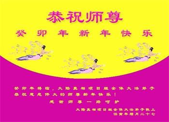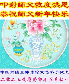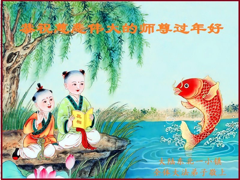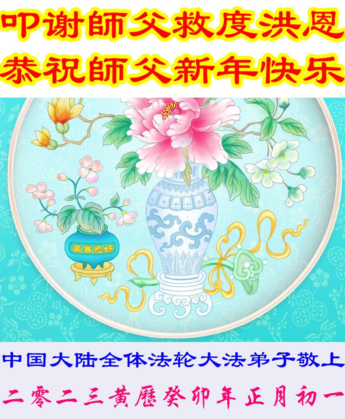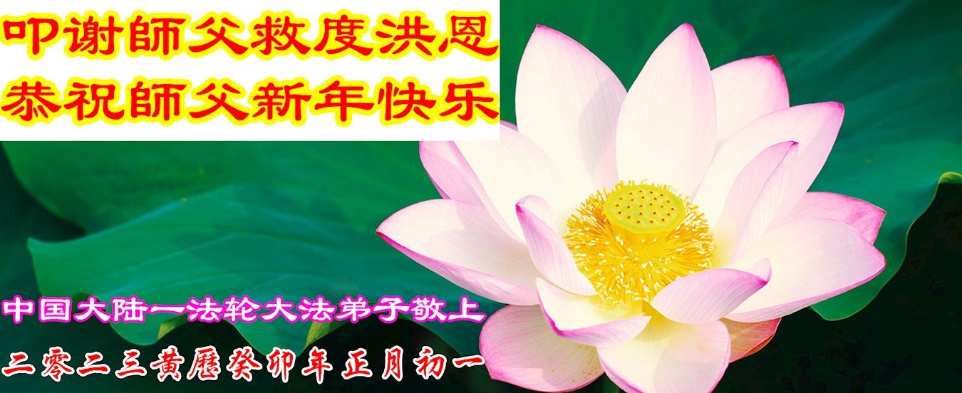 中国大陆全体法轮大法弟子恭祝慈悲伟大的师父新年快乐! 叩谢师父对弟子的慈悲苦度! 中国大陆两名大法弟子恭祝师尊新年快乐!