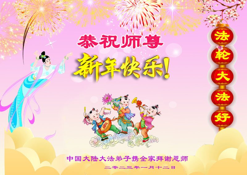 师尊您好!师尊辛苦了! 弟子一定多学法,学好法,跟师尊回家。 弟子叩拜师尊! 中国大陆一对夫妻大法弟子敬上 二零二三年一月七日 大陆一大法弟子恭祝师尊癸卯年快乐!