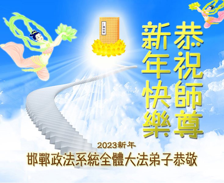 癸卯新年到了,正法已经到了最后的最后了,回想助师正法的日日夜夜,感慨万千。在这个十恶毒世里,我被安排在邪*党-迫害大法的链条上,伟大的师尊把我从地狱捞起,在尘世的迷茫中唤醒我的本性,提升道德,脱凡超俗,净化我的身心,又赋予我“大法弟子”的圣名,我深知自己的责任和使命。用尽人类的语言无法表达师尊的慈悲救度。弟子唯有精進实修,证实法 多救人以报答师尊,完成自己的史前大愿。。 大陆司法系统大法弟子携全家敬上 2023年1月18日 河北邯郸政法系统全体大法弟子恭祝慈悲伟大的师尊新年快乐!
