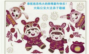 我们是黑龙江公检法系统内部的大法弟子,一直在秘密的为同修提供帮助。 在传统新年到来之际,我们恭祝师尊过年好,给师父拜年了!恭祝师父兔年大吉。我们会继续精進,做好自己的事,完成我们的使命,请师父放心! 辽宁省公安系统大法弟子家属恭祝伟大慈悲的师父过年好!