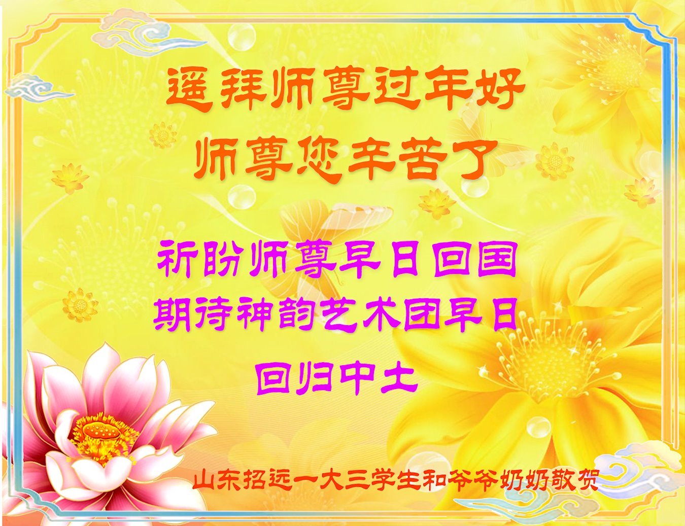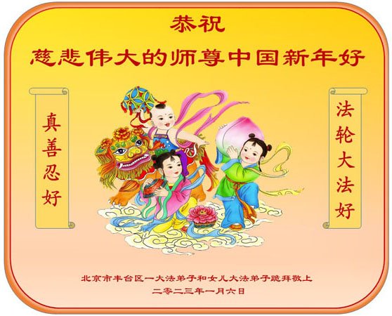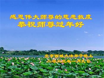 在过年即将到来之际,我们非常想念师父。在正法救度世人和助师世间行的过程中,不管旧势力怎么干扰,我们都会一如既往的做好三件事,多救人。众生能否被得救到了最后的时刻,我们将继续努力,完成历史赋予我们的使命。 感谢师父的慈悲苦度,在新的一年里,祝师父新年快乐!期盼与师父相见的日子快点到来。 再一次叩拜师父。 2023年1月17日 中国广东省政府部门大法弟子给师父拜年恭祝师父新年快乐!感恩师父慈悲苦度弟子!