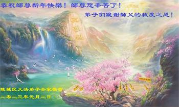 | 【明慧网二零二三年一月二十三日】大法洪传,福益众生;一人得法,全家受益。2023年中国新年到来之际,中国大陆千家万户大法弟子和家人恭祝李洪志师尊过年好! 修炼大法后祛病健身、道德回升的超常体验,使目睹奇迹的家人、甚至几代人感念大法的威德,或一起走入修炼。 辽宁省丹东凤城市一家族六位大法弟子恭祝师尊过年好!并表示:我们经过了得法时的喜悦、弘法的快乐!4.25,7.20对大法坚信的考验。在师父的慈悲保护下一直走到今天。我们比学比修,听师父的话,修好自己多救人。 华北油田一大法弟子携十八位受益于大法的亲人叩拜师父新年好!并写道:我们全家十八口给您拜年了!盼望您能早日回中国,我们以虔诚的心万分希望能仰望师尊威仪!我们的亲人在梦里见到您、醒来后都高兴得泪流满面! 宁夏银川市一大法弟子及父母兄弟一家三代人恭祝慈悲伟大的师尊过年好!这位大法弟子的父母及兄弟一家人诚念“法轮大法好,真善忍好”,在这次疫情中避过灾祸,受益了,特意在中国传统新年时问候师父好!感谢师父的慈悲救度! 重庆市长寿区大法弟子恭祝师尊新年快乐!