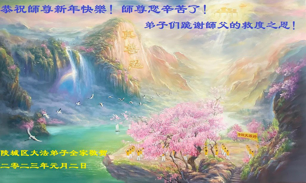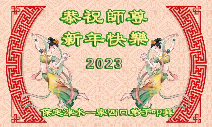 慈悲伟大的师父过年好!2022年我们经历了中共的极端防疫、动态清零、封城管控,我们正在经历中共突然断崖似的无预警、无准备、全面放开疫情管控,极端躺平,导致大陆疫情汹涌爆发、雪崩式蔓延、肆虐,触目惊心。在这波汹涌的疫情中,我们迎来了2023年中国新年。疫情的阴霾,却使不少世人亲身感受到“法轮大法好,真善忍好”九字真言的威力,弟子更是感受到师尊无所不在的看护。 弟子给慈悲的师父拜年了!师父过年好!您辛苦了!在这末后之末的乱象中,面对海啸般的瘟疫,我们要守好自己,不可被人心绊倒,救度众生中,我们要让世人牢记法力无边的九字真言,从而渡过万劫的生死关。 弟子再次叩拜师父!合十 辽宁省锦州市祖孙三代大法弟子恭祝师尊新年快乐!