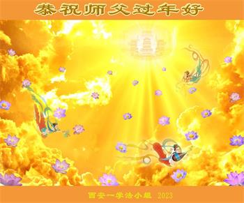 | 【明慧网二零二三年一月二十三日】跨过了又一年风风雨雨,迎来了不平凡的二零二三年,大法弟子们的点滴進步都溶入了师尊的心血,更多世人的觉醒与得救是师尊慈悲为众生换来的珍贵机缘。世间的语言难以表达众生对师尊的感恩!中国大陆各省市学法小组大法弟子恭祝师尊过年好! 武汉一学法小组大法弟子写道,回顾一年来的修炼过程,我们最大的收获是:对法理的认识、提升、升华。有的同修深切体会到矛盾或者魔难突然出现时,第一念就是“向内找”,确实立竿见影,这就是“正念”,更坚定了我们信师信法,百分之百的信师信法。 哈尔滨市学法小组大法弟子说:历经重重魔难,我们走过正法修炼时期,即将進入法正人间时期的修炼。我们深知,此时此刻的每一分、每一秒都至关重要,我们要用正念主导自己的一言一行,在有限的日子里,以弟子们修出的慈悲善念,救度更多的众生。 以下是部份来自江西、广东、北京、四川、湖南、辽宁、山东、黑龙江、河北、陕西、吉林、湖北、内蒙古、天津、湖南、云南、福建、贵州、宁夏等省市的学法小组大法弟子,以贺信方式,用恭敬的心向慈悲伟大的李洪志师父拜年! 河北张家口蔚县西合营一学法小组大法弟子给师尊拜年!恭祝师尊过年好!