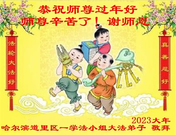 黑龙江哈尔滨市道里区一学法小组大法弟子恭祝师尊过年好! 师尊辛苦了!历经重重魔难,我们走过了二十三年的助师正法修炼,即将進入法正人间的修炼。正法修炼阶段的结束,意味着新宇宙历史的开始。 我们深知,此时此刻的每一分、每一秒都至关重要,这关乎我们修炼的是否能够圆满。我们要用大法衡量自己的一思一念,用正念主导我们的一言一行。在法中归正我们的现代观念行为与人心执着。在有限的日子里,以弟子们修出的慈悲善念,救度更多的众生,让师尊多一份欣慰,少一份辛劳,惟愿师尊笑。 哈尔滨市道里区一学法小组大法弟子敬上 二零二三年一月十一日 吉林省松原市学法小组大法弟子恭祝慈悲伟大的师尊新年快乐!