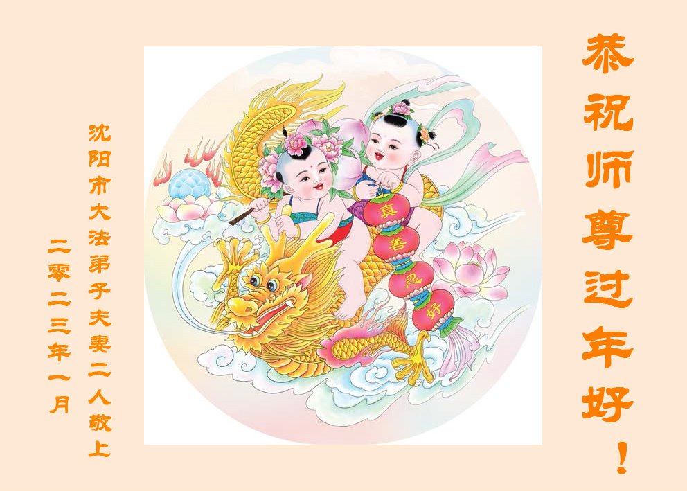 在新的一年中,我们全家大法弟子要好好修炼,珍惜时间,听师父的话,做好三件事,跟师父回家。 沈阳市浑南区一家庭大法弟子全家敬上 二零二三年一月二十日 辽宁省沈阳大法弟子恭祝师尊新年好!