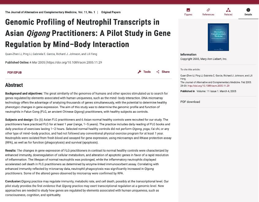通过对法轮功修炼者的血液白细胞进行实验,利用DNA微列(Microarray)和RNA保护等技术研究嗜中性粒细胞(人体主要免疫细胞之一)的基因表达情况,对比了一组修炼法轮功一年以上的修炼者与健康的非修炼者之间的异同。在被检测的13,000个基因中,发现有250个基因的表达活性在法轮功修炼者组群中出现变化:与正常健康人相比,法轮功修炼者的嗜中性白细胞之吞噬和杀伤细菌的功能明显增强,显著增加了与抗御病毒有关的调节基因(例如干扰素-γ),能对各种外来病毒、细菌具有更强的抵抗力(免疫力)。 另一个重要发现是,这些人的免疫细胞具有独特的“双向调节机制”。他们的嗜中性白血球在正常状态(无炎症)下,寿命比普通人长,加上吞噬力也强,因而更有利于保护机体;可是在发炎状态下,嗜中性白血球消灭病原体之后,却会迅速凋亡,从而有利于快速消解炎症,避免发生“细胞因子风暴”(免疫反应过度)。 《替代与补充医学期刊》对论文评价称,这是期刊一直在期待的试验,以比较全面的方式来看精神和身体(MIND AND BODY)的相互作用。法轮功修炼者并没有依靠物质手段改变身体,而是以真善忍为原则,提升道德与精神层次,但是却使得身心得到了超乎寻常的净化。 二零零二年,在美国全国范围的调查表明有百分之三十的美国成人采用补充医学和替代医学(CAM)的治疗手段。且另一项研究表明,在美国,学历越高的人选择补充医学和替代医学的倾向性越强。 在世界各地,从纽约到伦敦、东京、柏林、巴黎、台北等,在旅游景点、市政广场都可以看到“法轮大法”的条幅,法轮功学员或者打坐,或者炼功,法轮功在100多个国家和地区受到了欢迎。从法轮功学员身上,人们看到传统的道德正在回归,以高尚的心灵面对一切,以正直的精神洗涤污浊。 对癌症患者的定量研究 法轮功修炼者的奇迹,引起越来越多研究者的关注与机构的证实。 2016年6月,美国临床肿瘤学会(ASCO)官网发表题为“关于修炼法轮功延长癌末病患存活及改善或治愈其症状”(An observational cohort study on terninal cancer survivors practicing falun gong(FLG)in China)的论文,ASCO年会是全球最大、最具影响力的癌症、肿瘤学术研究的医学年会,每年吸引逾三万名来自全球的肿瘤学专家参加。