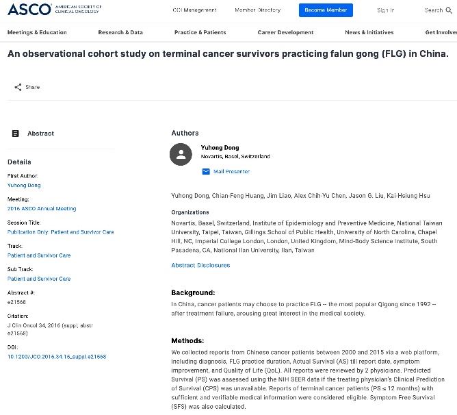 美国临床肿瘤学会(ASCO)官网发表《关于修炼法轮功延长癌末病患存活及改善或治愈其症状》的论文 (网络截图) |