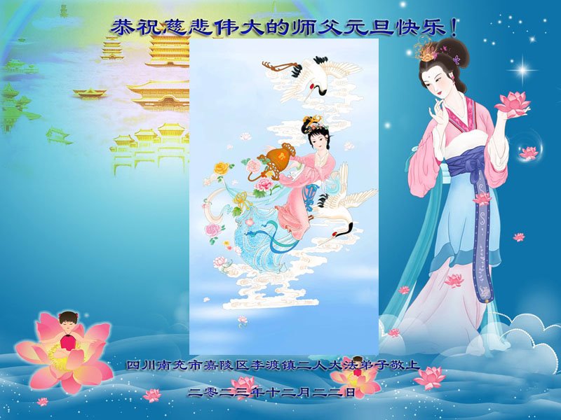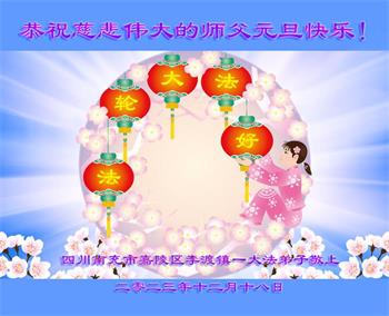 慈悲伟大的师尊新年好!我们学习了师父今年发表的几篇经文,内心无比的震撼,更加珍惜这万古难遇的修炼机缘,请师父放心,我们一定实修真修,放下怕心勇猛精進,修炼如初,圆满完成大法弟子的历史使命,兑现自己史前的誓约。 绵阳永兴镇全体大法弟子叩拜师父! 四川省德阳市夫妻大法弟子恭祝慈悲伟大的师尊新年好!