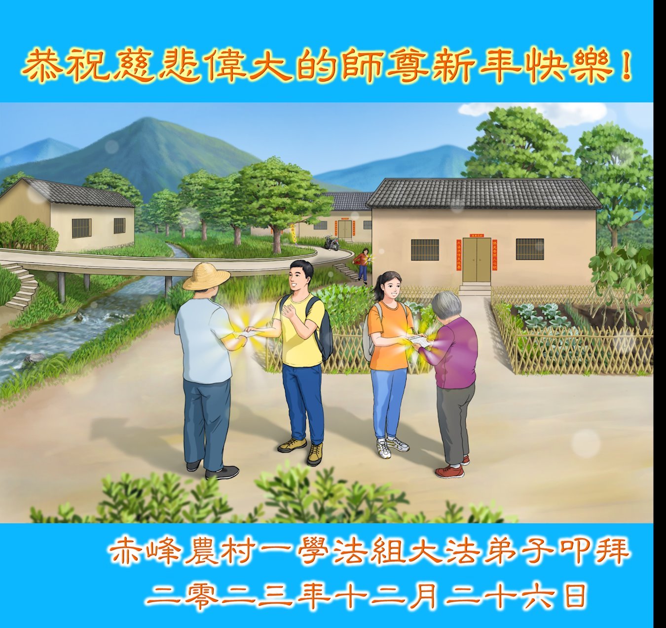 【明慧网二零二三年十二月三十一日】 北京昌平农村一大法弟子携妻子、女儿、朋友恭祝师父新年好!