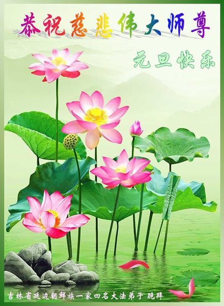 我们是大陆大法弟子夫妇,我们全家祝师尊元旦快乐!弟子一定要精進实修,牢记师尊的教诲,多多学法,多救人,做好三件事,修好自己,圆满随师还。 本溪桓仁县朝鲜族大法弟子恭祝慈悲伟大的师尊新年快乐!
