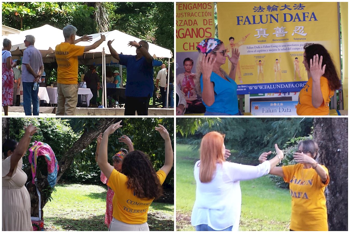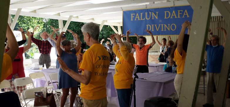 两位来自多米尼加共和国的游客路过时,一位学员向他们介绍了法轮大法;他们了解到在多米尼加也有法轮功学员。他们欣然同意学员邀请,现场学炼法轮功功法。他们告诉学员,炼功后,感觉到放松、平静和愉悦,还感受到他们的手部有强大的能量流。 一位瑜伽教练和一位学瑜伽的学生尝试了法轮功的第二套功法,并说他们感受到了一种温和的宁静,不再烦恼。 一位女士问学员“法轮大法”是什么意思。学员给她做了讲解,她听得很认真。她对修炼者如何通过修炼、祛病健身特别感兴趣。她学习了法轮功第二套功法,并询问了何时能参加每周一次的集体炼功。  图3:当觉醒节快结束时,所有人都被邀请尝试学炼法轮功的第二套功法。 |