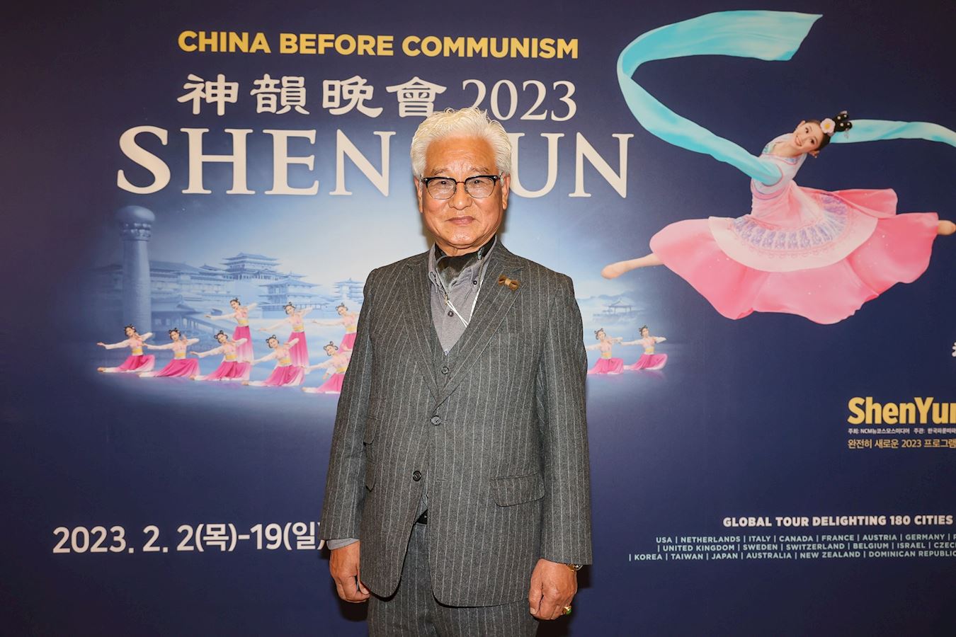 身为文学博士、在文艺界享有盛誉的崔赏润教授,对神韵于艺术文化的整体价值,他表示,“我给予最高赞誉!” 崔赏润认为,神韵“这部作品非常有价值”,“让任何人看了都会发出赞叹”。 他说:“其中最让我印象深刻的是动态舞台背景。神韵活用了现代科技,创造出栩栩如生的舞台背景,其间充满了生动感、现实感,真的是了不起的技术能力!” “我对于(神韵)艺术总监非常尊敬。”三度观看神韵的崔赏润说:“(神韵艺术总监)完美策划舞蹈、戏剧、音乐乃至服装,还运用科技创作出的舞台天幕背景,真的无论看多少遍,都会吸引目光,引人入胜。” 崔赏润再次对神韵总监表达敬意,他说:“一般人会在一个领域非常出色,但能将这么多专业领域汇总到一起的,他(神韵艺术总监)能针对多元领域进行综合策划,这种综合汇总能力非常了不起,真的十分值得尊敬,非常了不起!” 大学教授:人类面临危机 神韵指出希望道路 .纪.元;)'> 图8:二零二三年二月二日晚间,釜山大学教授金声振观赏神韵世界艺术团在韩国釜山昭香剧场(Sohyang Theatre)的首场演出(大.纪.元;) |