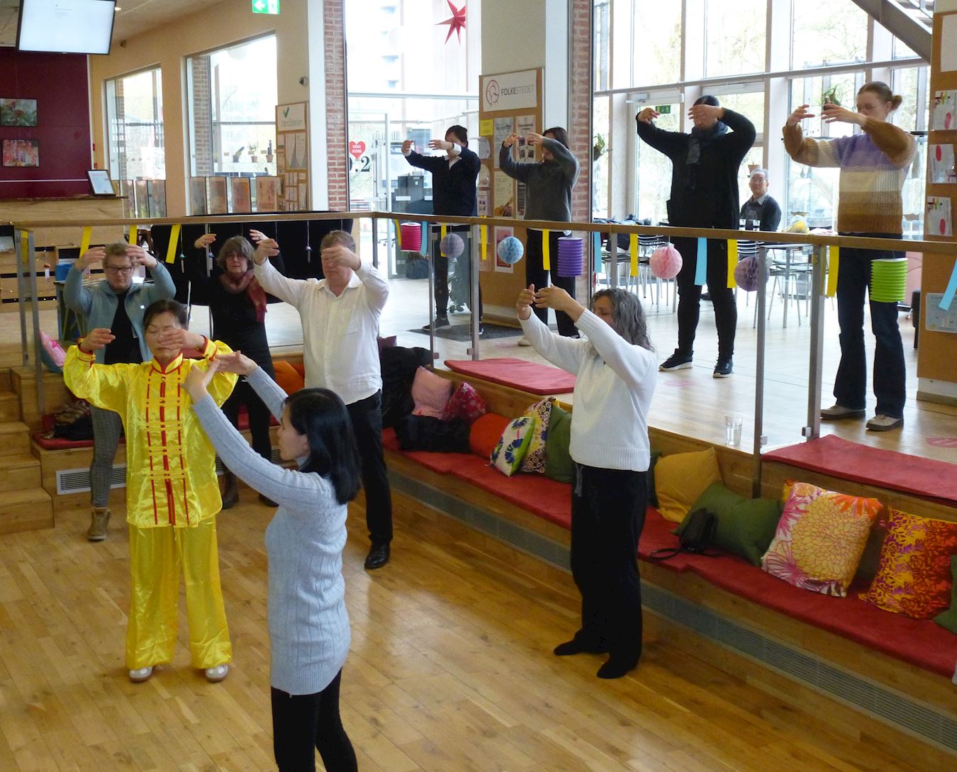 | 【明慧网二零二三年二月八日】(明慧记者舒慧丹麦报道)二零二三年二月五日,立春后的第一天,正值中国的传统节日元宵佳节之际,部分法轮功学员在丹麦的第二大城市奥胡斯市(Aarhus)中心的文化中心,举办活动,介绍法轮功,吸引了很多民众。有些人在以前的健康博览会上,得到过法轮大法资讯,这次又见到了法轮功学员,很多人表示想学功。 腰鼓鼓声在“法轮大法好”的乐曲中敲响,学员打着喜庆的腰鼓迎接嘉宾的到来。法轮功学员还准备了传统的元宵节食品:汤圆,春卷等。活动结束后,很多人都表示:“明年再见!” 接下来新老中西方学员集体炼功,没学过功的人也很有兴致地加入跟着学炼。大家都感受到祥和宁静的能量场。 阿德里亚娜(Adriana)女士和家人一起参加活动,炼完功后她表示:“我感觉很好,很舒服,很强的能量。”她的女儿留下联系方式,表示要继续学炼法轮功。  图1~2:很多民众加入中西方学员的集体炼功 |
