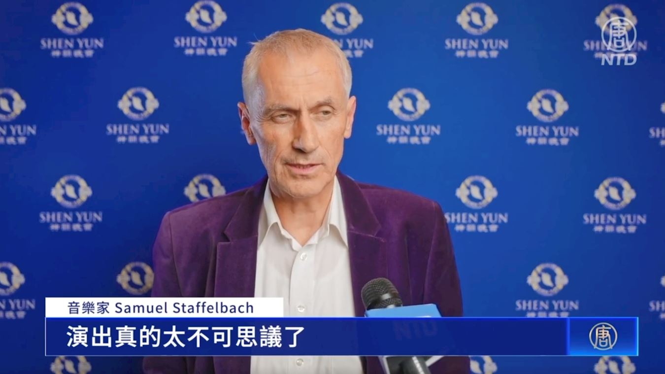 这是密西沙加市议员布拉德·巴特(Brad Butt)第三次观看神韵,他表示:“节目令人感动,人们不该因宗教信仰而被迫害、攻击、杀害。人们有权选择自己的信仰,并付诸实践,任何人都有权以自己认同的方式敬拜自己的神明。” 巴特说:“中国历史上经历过许多冲突与战争,就象世界其它地区一样,经过岁月变迁成为历史,那样的故事对今天的我们非常重要,以史为鉴,我们可以誓言不让历史上那些黑暗片段重蹈覆辙,社会才能发展。整台演出充满善、关怀,以及快乐,同时也展现了中国历史上一些抗争、不幸,甚至悲惨的故事,那些历史非常重要。” 音乐家赞神韵:美与神性完美结合 独一无二 !唐!人:电视截图)'> 图9:二零二三年三月二十四日晚,音乐家塞缪尔·斯塔夫巴赫(Samuel Staffelbach)在瑞士巴塞尔音乐剧院观看了美国神韵国际艺术团的演出。(新!唐!人:电视截图) |