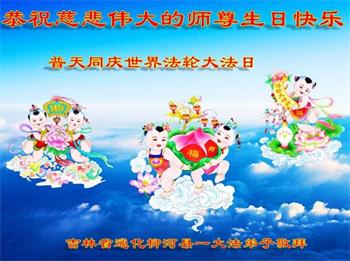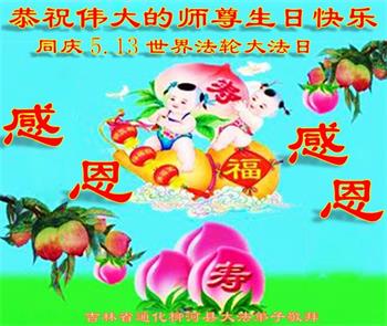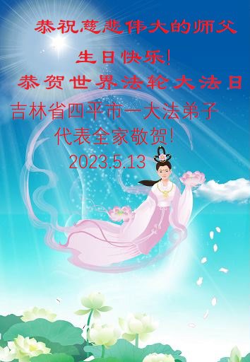 吉林省四平市一大法弟子代表全家恭祝慈悲伟大的师父生日快乐!恭贺世界法轮大法日!
