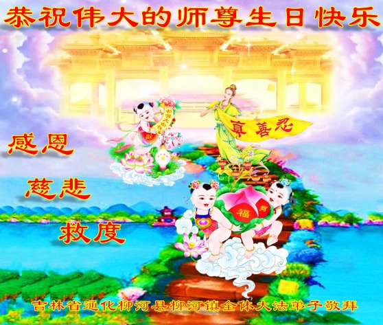 感恩师尊慈悲救度!师尊您辛苦了! 我们真诚的感恩师尊把大法能够“理白言明”细致入微的传授给弟子,让弟子腾飞升华,这是历代的修炼人都不可比拟的。特别是师尊把大法弟子放置到世间最险恶、最复杂的人群处,中原大地上魔炼二十多年,金刚已成,众王众主,凤凰欲火重生,炼就成救度众生的觉者和未来宇宙天体重大使命与责任的担当者。这是师尊亿万年含辛茹苦的精心造化。宇宙正法开创出来新天、新地、新众生,这是宇宙天体最震撼人心的一部史诗。感恩啊!我们慈悲伟大的李洪志师尊! 敬拜师尊!合十 吉林省通化柳河县柳河镇全体大法弟子恭祝慈悲伟大的师尊生日快乐!普天同庆五·一三世界法轮大法日!
