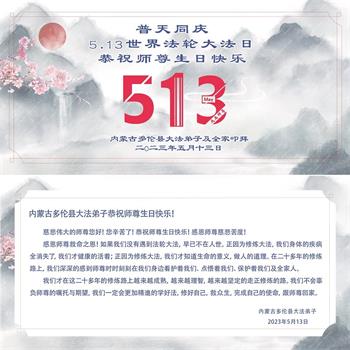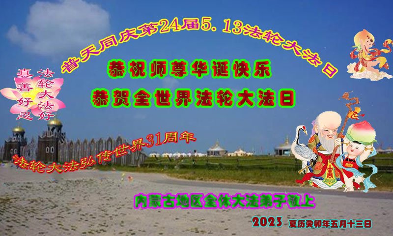 5月13日是世界法轮大法日,也是师尊的生日,恭贺法轮大法日!恭祝师尊生日快乐!弟子们一定要精進、再精進,不负师恩! 内蒙古自治区赤峰市巴林左旗全体大法弟子恭祝师尊生日快乐!