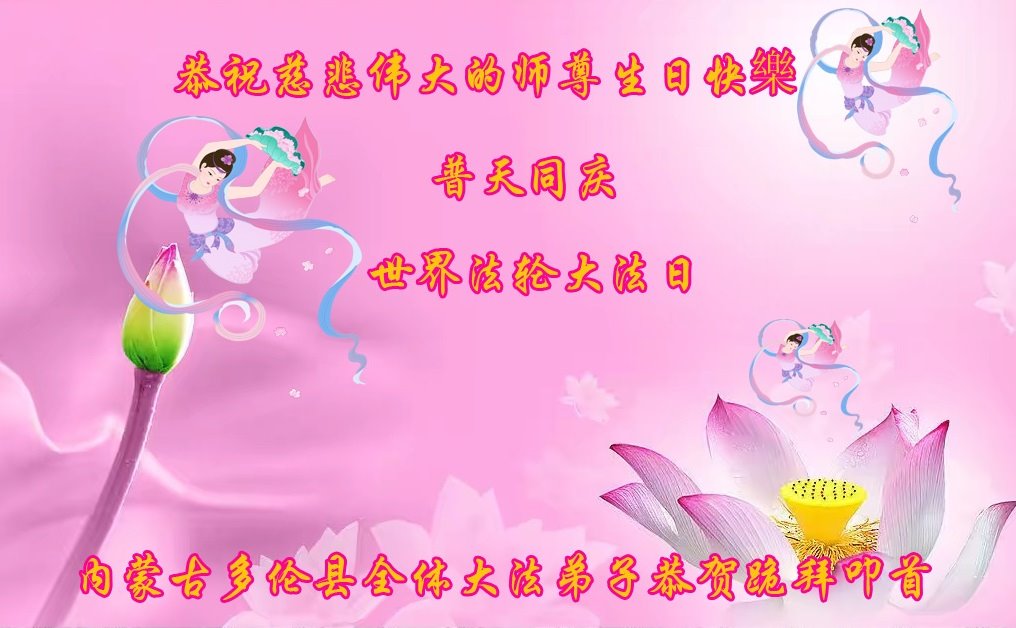 恭贺世界法轮大法日! 感恩师父将我从地狱中捞起;感恩师父给了我一个健康的身体、豁达的胸怀;感恩师父使我知道了来世当人的目地,找到了回家的路。 在大法的指引下,使我明白了得失、看懂了世间的恩怨,知晓了善恶与因缘。使我这个迷失在红尘中,为名利情苦苦挣扎的生命获得了新生! 在师尊生日来临之际,衷心祝愿师尊生日快乐!多一些开心,少一些操劳! 内蒙赤峰大法弟子恭祝 内蒙古地区全体大法弟子恭祝师尊华诞快乐!恭贺世界法轮大法日!