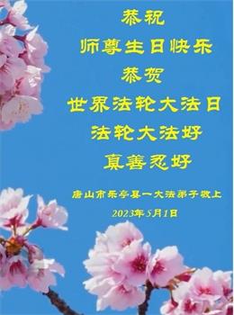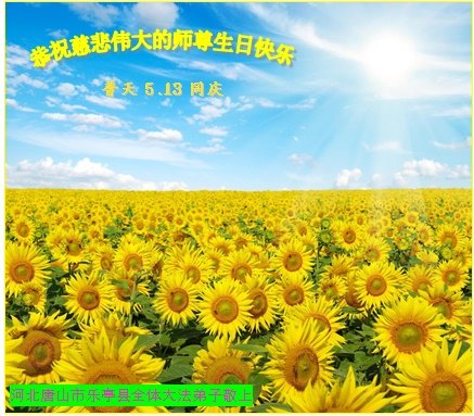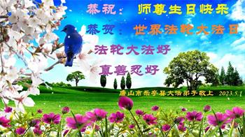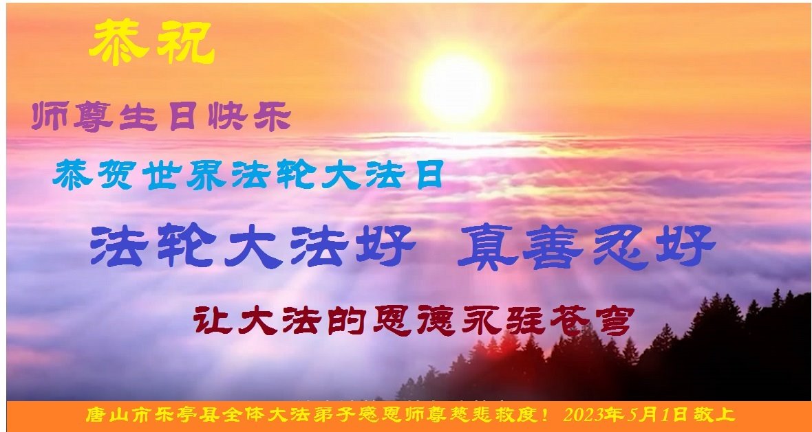值此伟大的日子,祝伟大的师尊生日快乐! 我们三大法弟子,谨遵师尊的希望,做好三件事,做一个合格的大法弟子。 2023年5月4日 河北省唐山市乐亭县全体大法弟子恭祝恩师生日快乐!