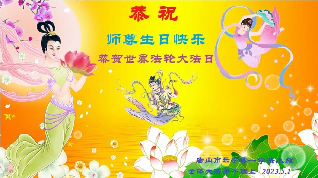 普天同庆、同祝、同颂世界法轮大法日! 亿万年的等待,随师层层下走,演绎五千年神传文明。正法开传,弟子们终于结上了圣缘。证实法,救众生。兑现神的誓约。 请师父放心,弟子们一定会多学法、向内找,做好三件事。整体跟上正法進程,圆满随师还! 法轮大法好、真善忍好!师父生日快乐! 2023年5月2日 河北唐山市一家大法弟子恭贺世界法轮大法日!