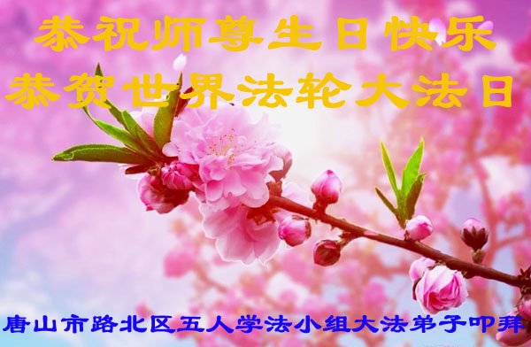 春天来了,百花开了。在这春光明媚的日子里,我们迎来了我们法轮大法日。在这普天同庆的美好时光里,恭祝慈悲伟大的恩师生日快乐!恭贺世界法轮大法日!感恩恩师慈悲救度!感恩恩师一路保护!使弟子在“助师正法”的神路上平稳的走到了今天。今后不管时日长短,不管路途如何艰险,弟子一定沿着恩师指的路,前行!前行!再前行!直至圆满!愿恩师少一些操劳,多一些欣慰。 叩拜恩师 丰润区一大法弟子敬上 河北唐山开平东山夫妻学法小组及家属恭贺世界法轮大法日!