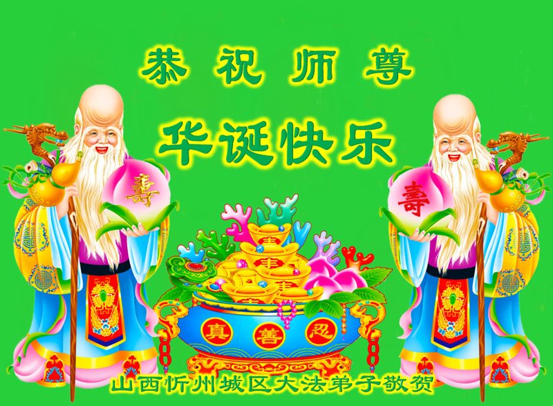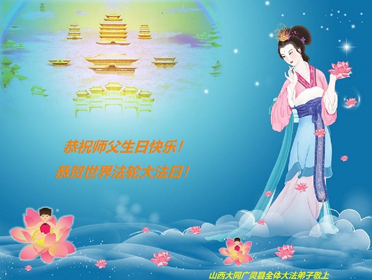 值此普天同庆的节日,感恩师父的慈悲苦度和一路保护,感恩全世界大法弟子们的无私帮助,恭祝师父生日快乐!全世界大法弟子法轮大法日快乐!再次叩谢师父,师父辛苦了,叩首! 山西大同广灵县全体大法弟子敬上 山西广灵一大法弟子祝贺师尊生日快乐!恭贺世界法轮大法日!