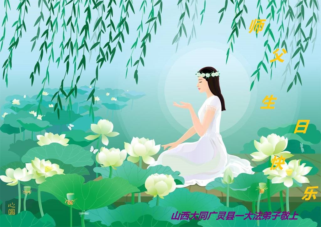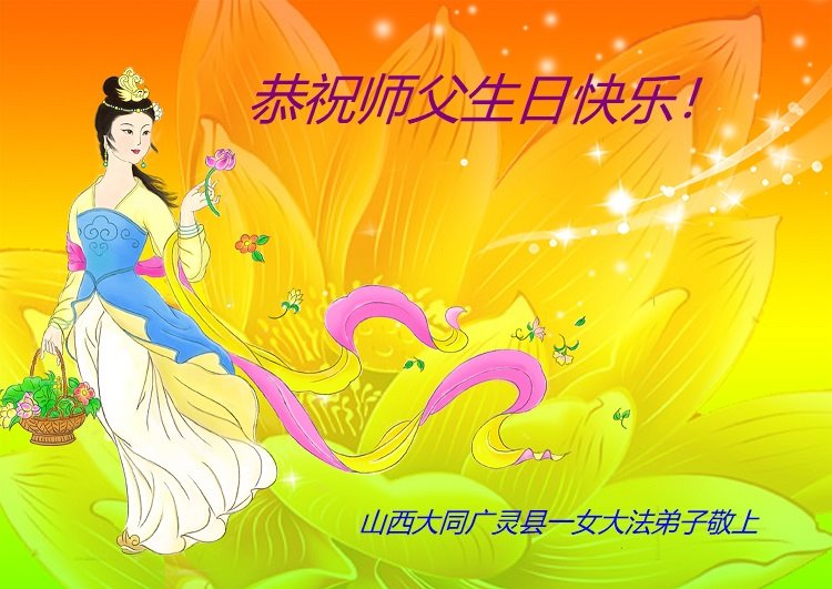 恭祝师父生日快乐!祝世界法轮大法日快乐! 磕磕绊绊走到今天,离不开慈悲伟大师父的一路保护和点悟。大法净化了我的身心,洗涤了我的心灵,从执着名利到现在心态纯净,遇到矛盾能坦然面对。感恩师父对众生的无量慈悲与巨大付出,弟子无以为报师父的佛恩浩荡,只有精進再精進,做好三件事。跟师父回家 山西大同广灵县大法弟子敬上 山西大同广灵县大法弟子恭祝恩师生日快乐!恭贺世界法轮大法日!