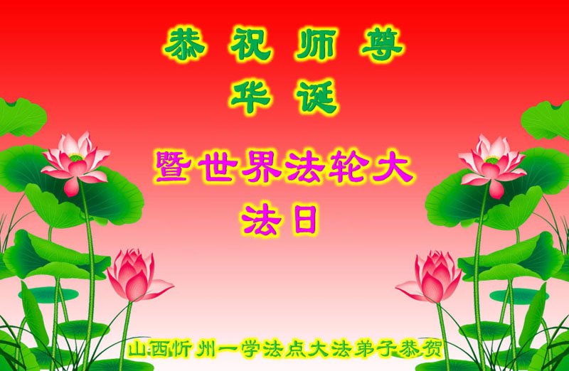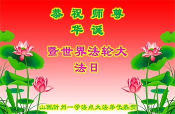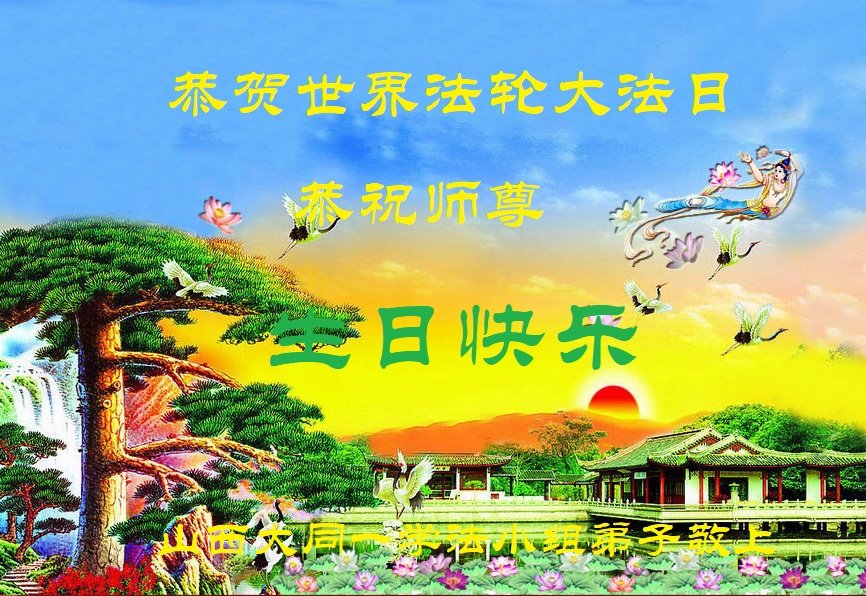 师父:弟子们一定多学法,学好法,做好弟子该做的事,兑现誓约,完成使命。 山西广灵县全体大法弟子恭祝师父生日快乐!恭贺世界法轮大法日!