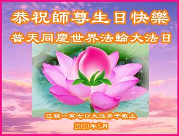 恭祝师尊生日快乐!普天同庆世界法轮大法日! 江苏一家七口大法弟子敬上 2023年5月 江苏省南京一大法弟子携家人恭祝伟大的师尊生日快乐!