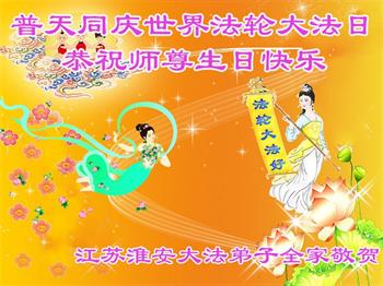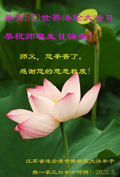 【明慧网二零二三年五月十一日】 江苏淮安大法弟子全家普天同庆世界法轮大法日!恭祝师尊生日快乐!