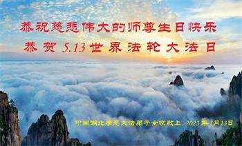 我们怀着对伟大师尊的无限感恩,恭祝慈悲伟大的师尊生日快乐! 我们在修炼的路上会坚定不停,实修精進、讲真相、做好三件事多救人。 湖北省赤壁市蒲纺工业园全体大法弟子叩拜 二零二三年五月二日 湖北省黄冈全体大法弟子同祝同庆同贺伟大的师尊生日快乐暨世界法轮大法日!