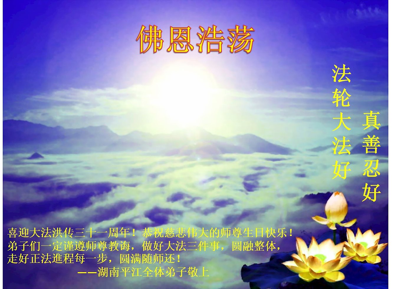 湖南益阳沅江市全体大法弟子恭祝伟大师尊生日快乐!祝贺大法洪传三十一周年!